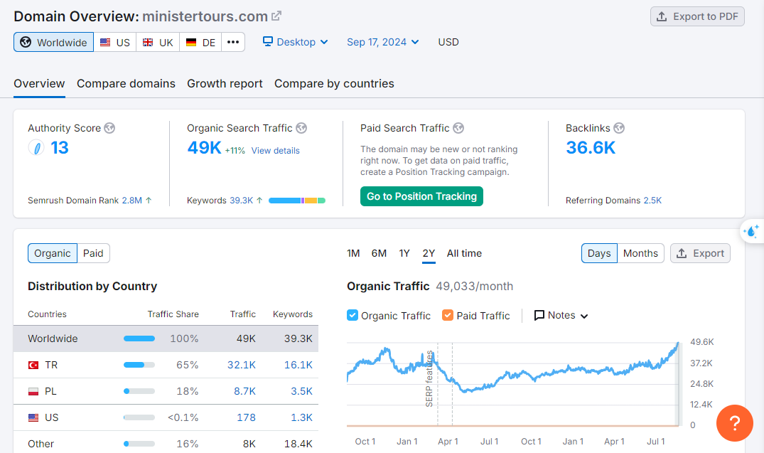 With an authority score of 13, MinisterTours.com had difficulty ranking for high-traffic travel-related keywords, often competing with larger, well-established travel platforms.